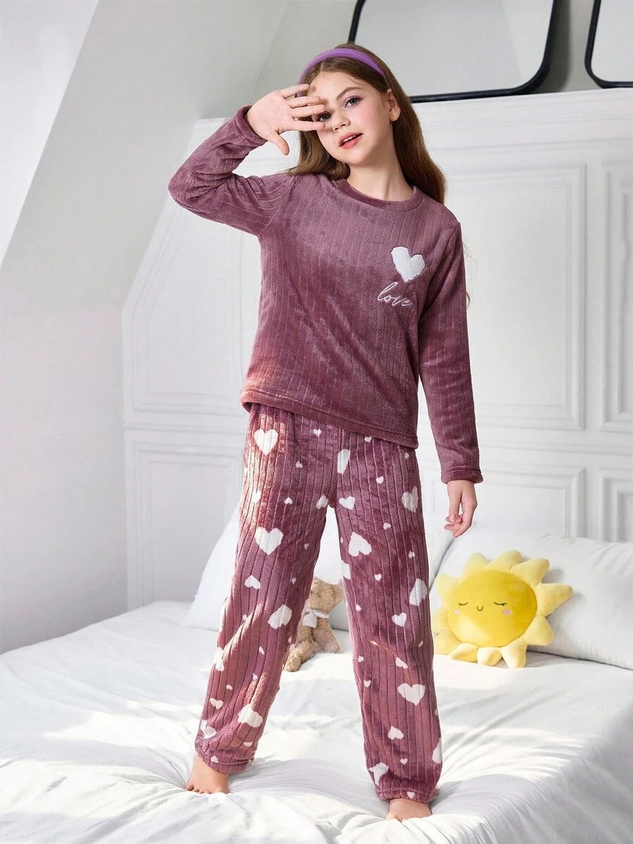 بيجامة بنات مطبوعة بالقلوب بأكمام طويلة وبنطلون