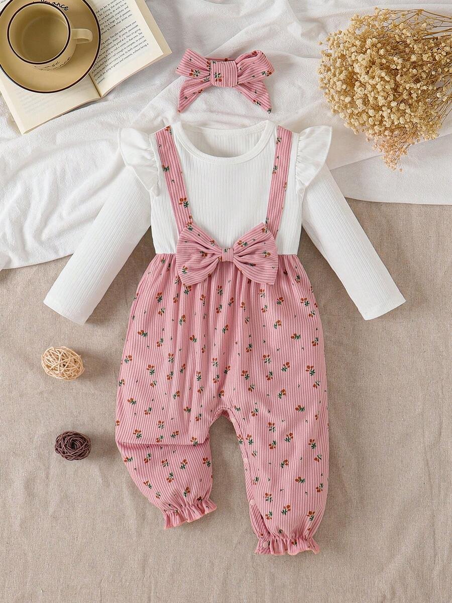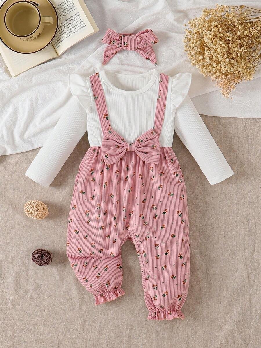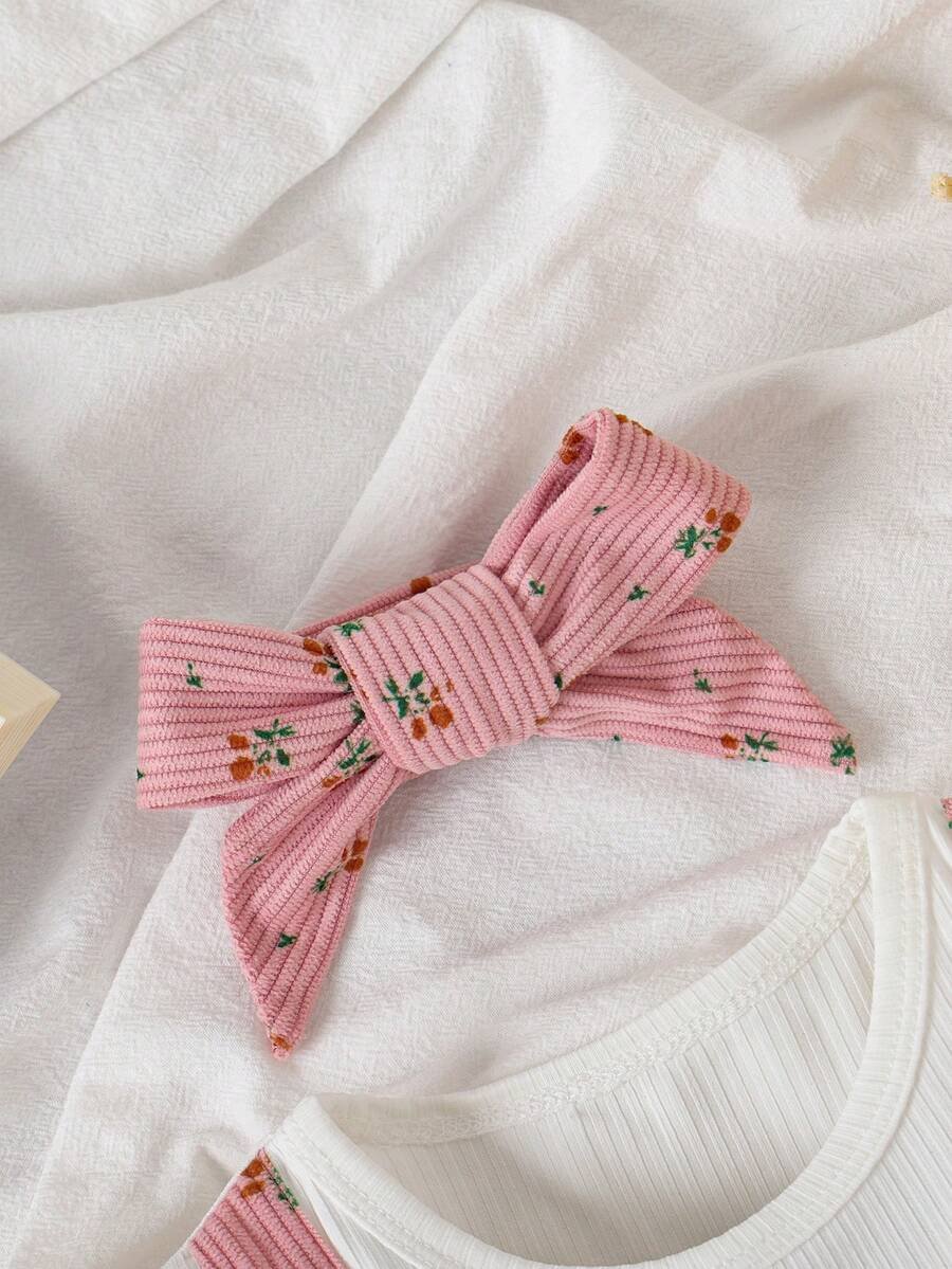 طقم سالوبت وردية بطبعة زهور مستديرة الأكمام، وجوارب بفيونكة، وعصابة للرأس