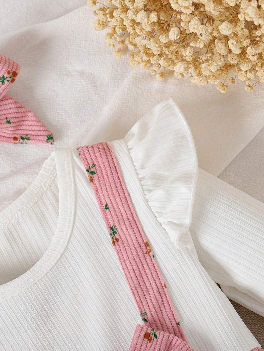 مجموعة من 3 قطع (طقم ببلوزة بحواف دانتيل _بنطلون بطبعات زهور _شريط رأس)