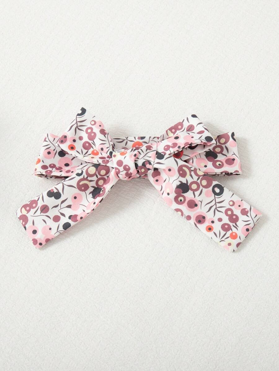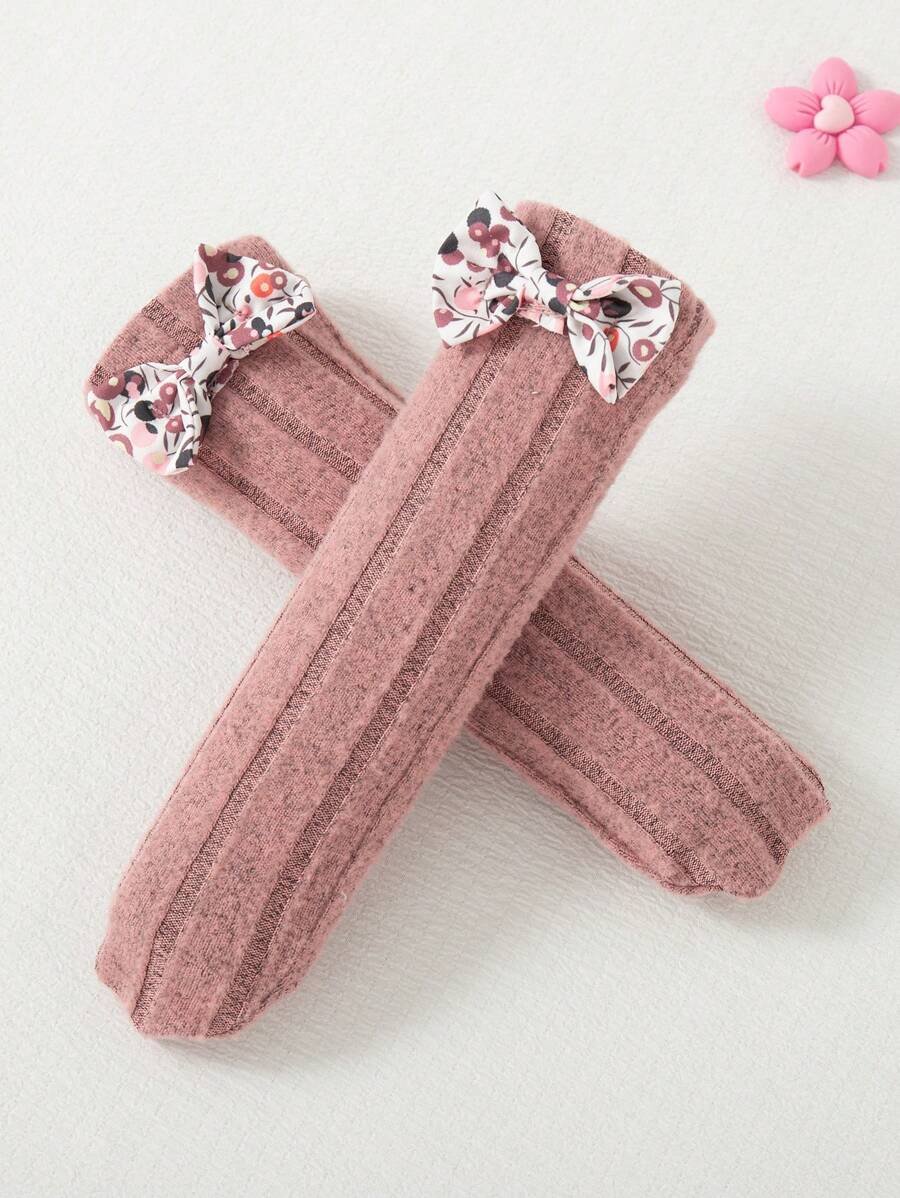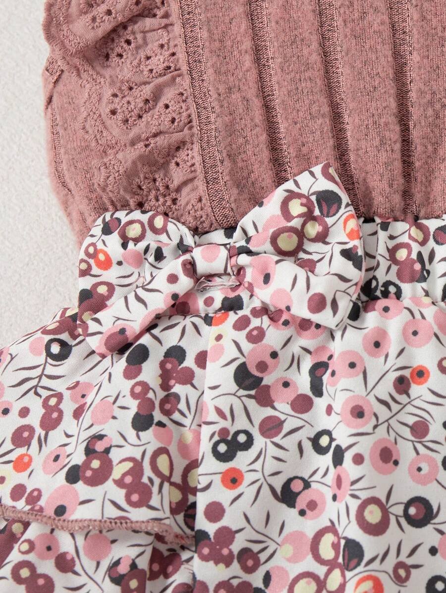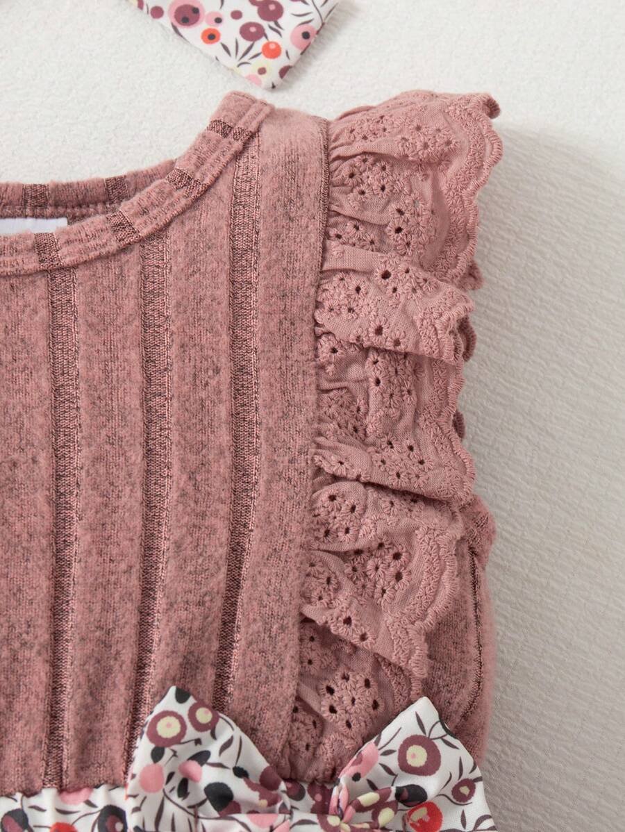 - اسم المنتج: طقم سالوبت وردية بطبعة زهور مستديرة الأكمام، وجوارب بفيونكة، وعصابة للرأس