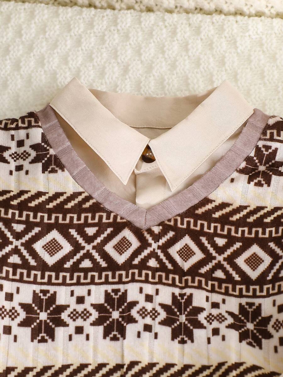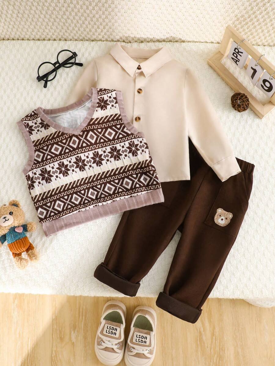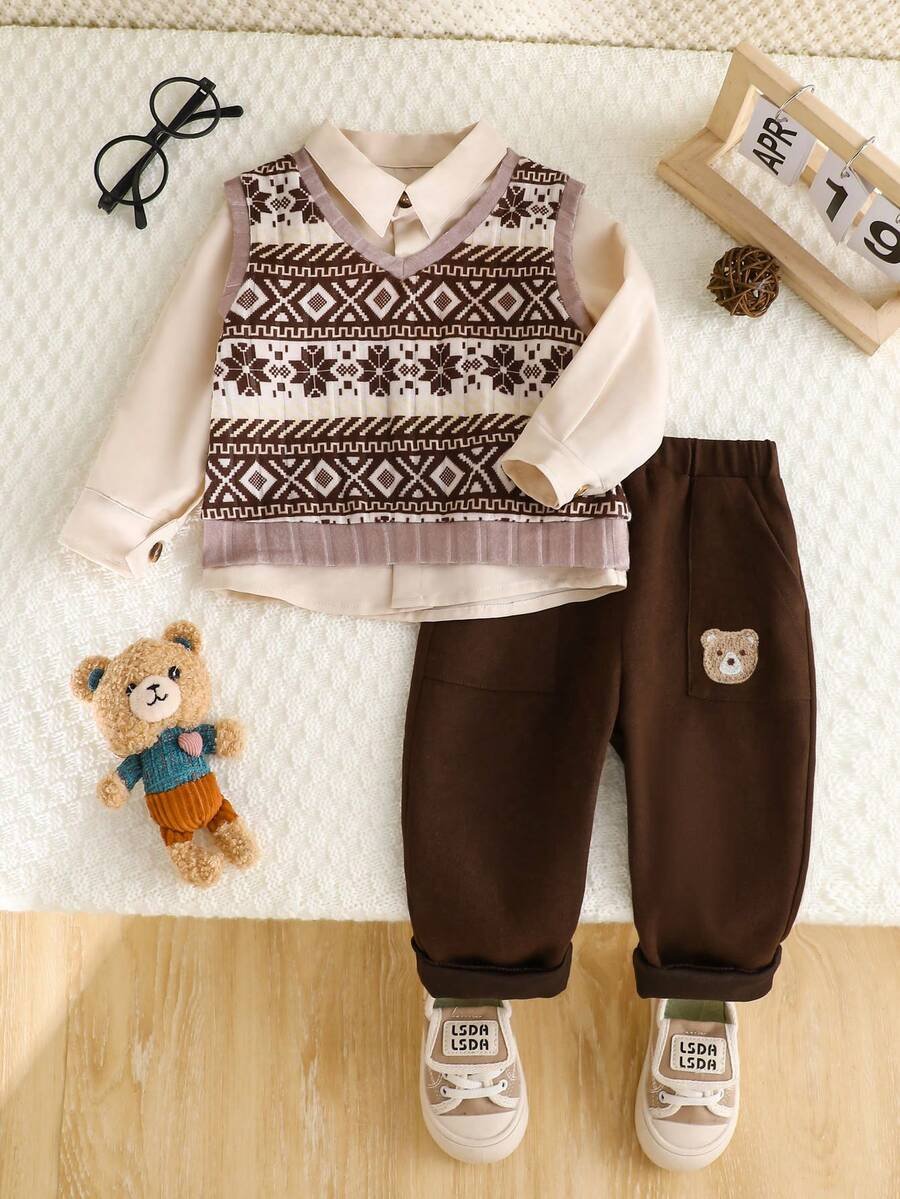 طقم 3 قطع – بنطلون محبوك وقميص بأكمام طويلة وياقة – بطبعة دب
