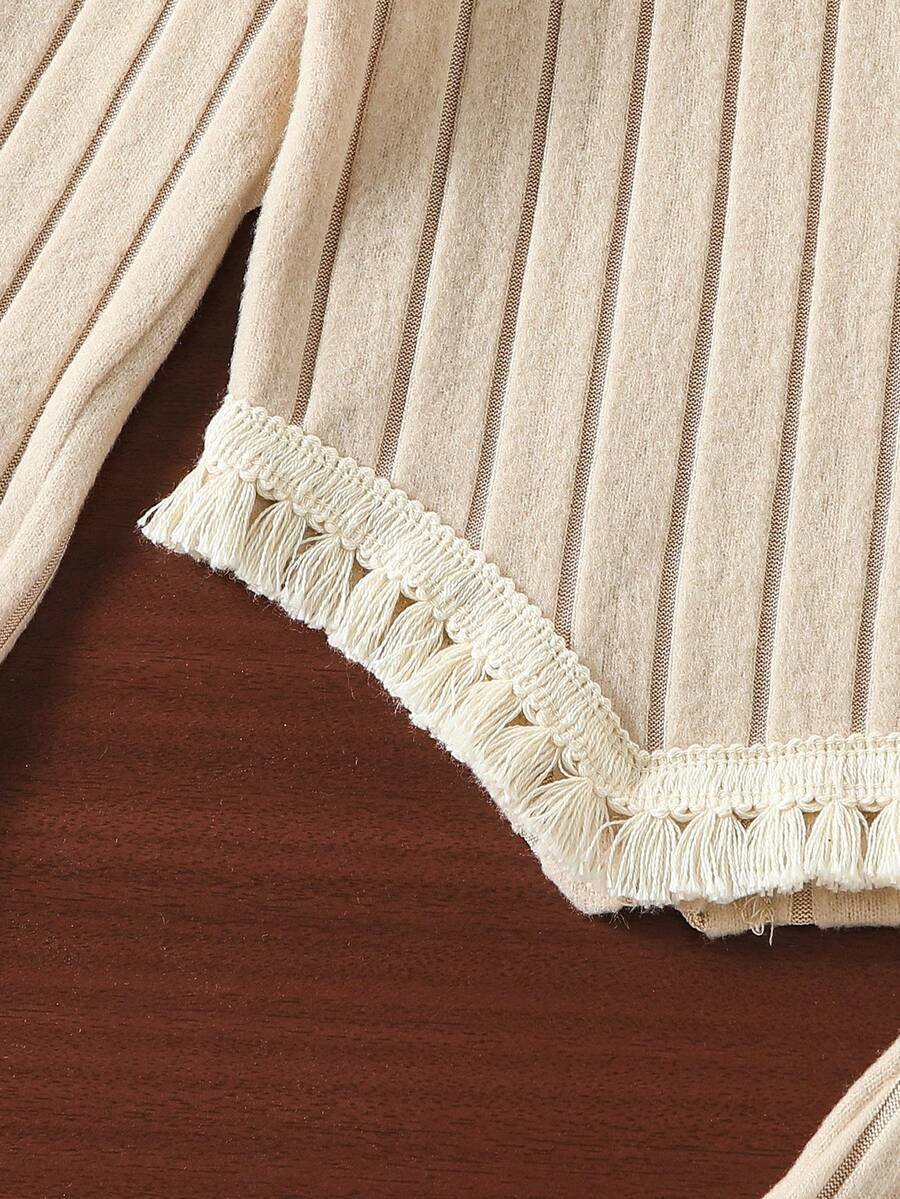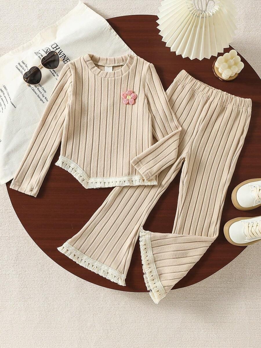 طقم كنزة صوفية طويلة الأكمام مزينة بزهرة وشرابة وبنطلون مطاطي