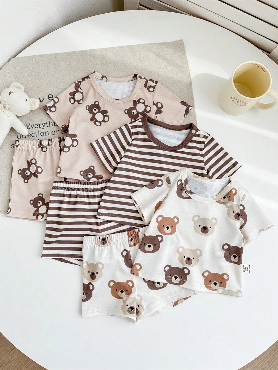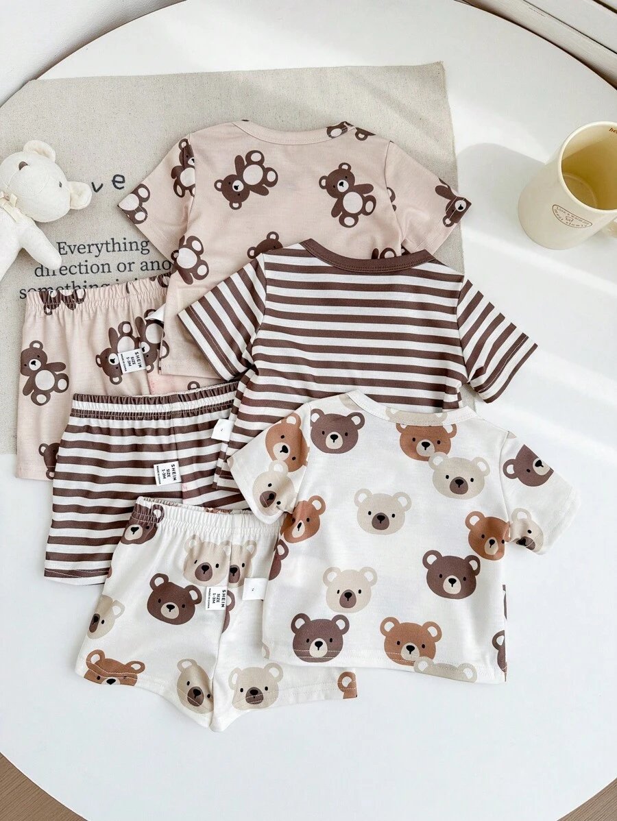 مجموعة 6 قطع ( 3 أطقم ) بلوزة قصيرة الأكمام وشورت بطباعة كرتون دب وخطوط