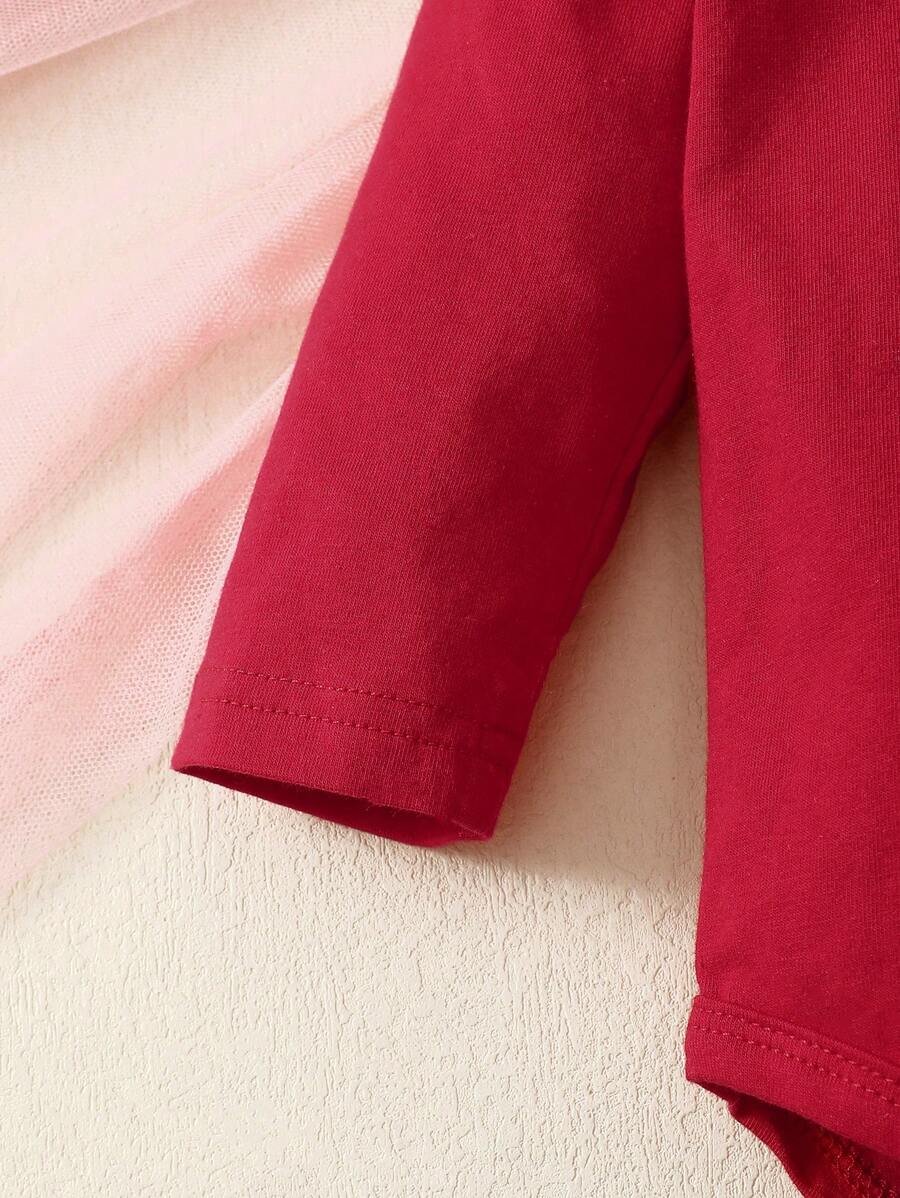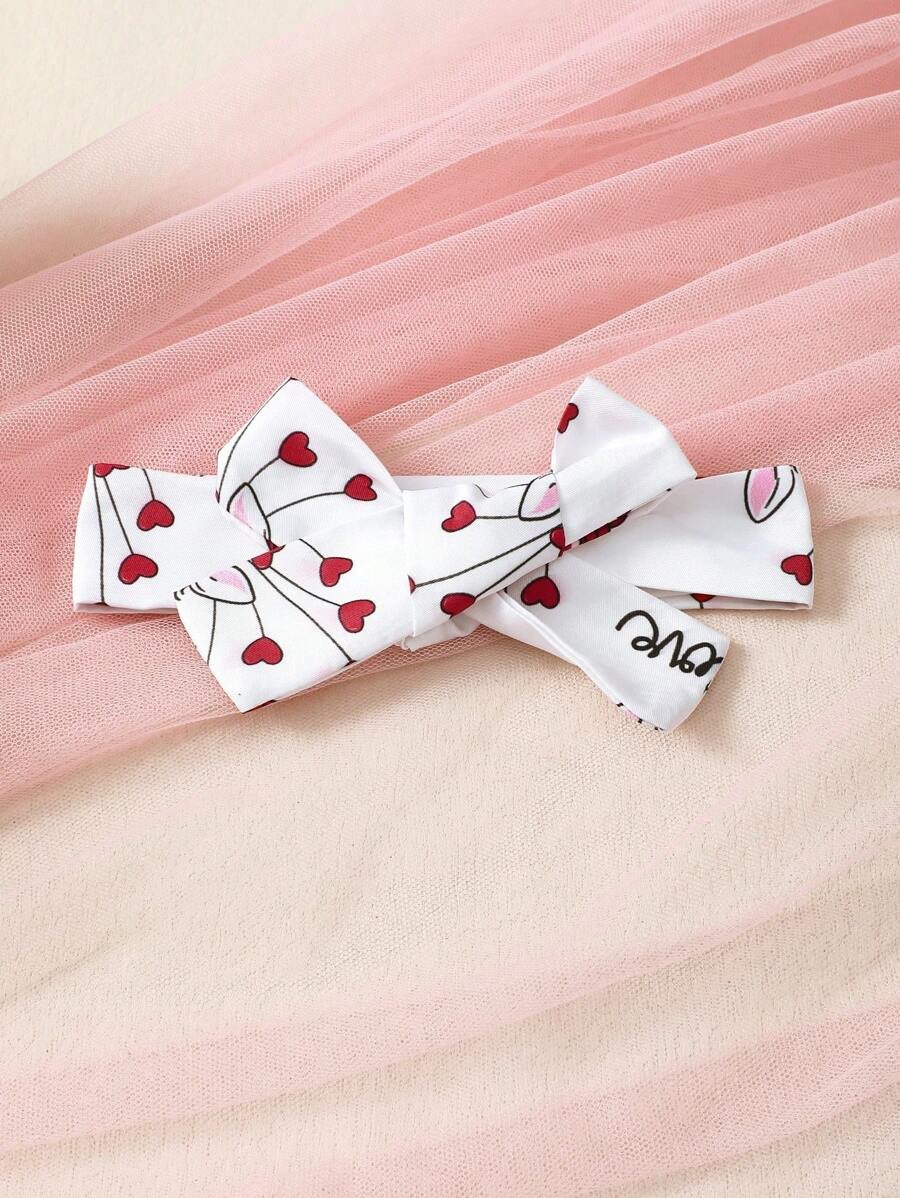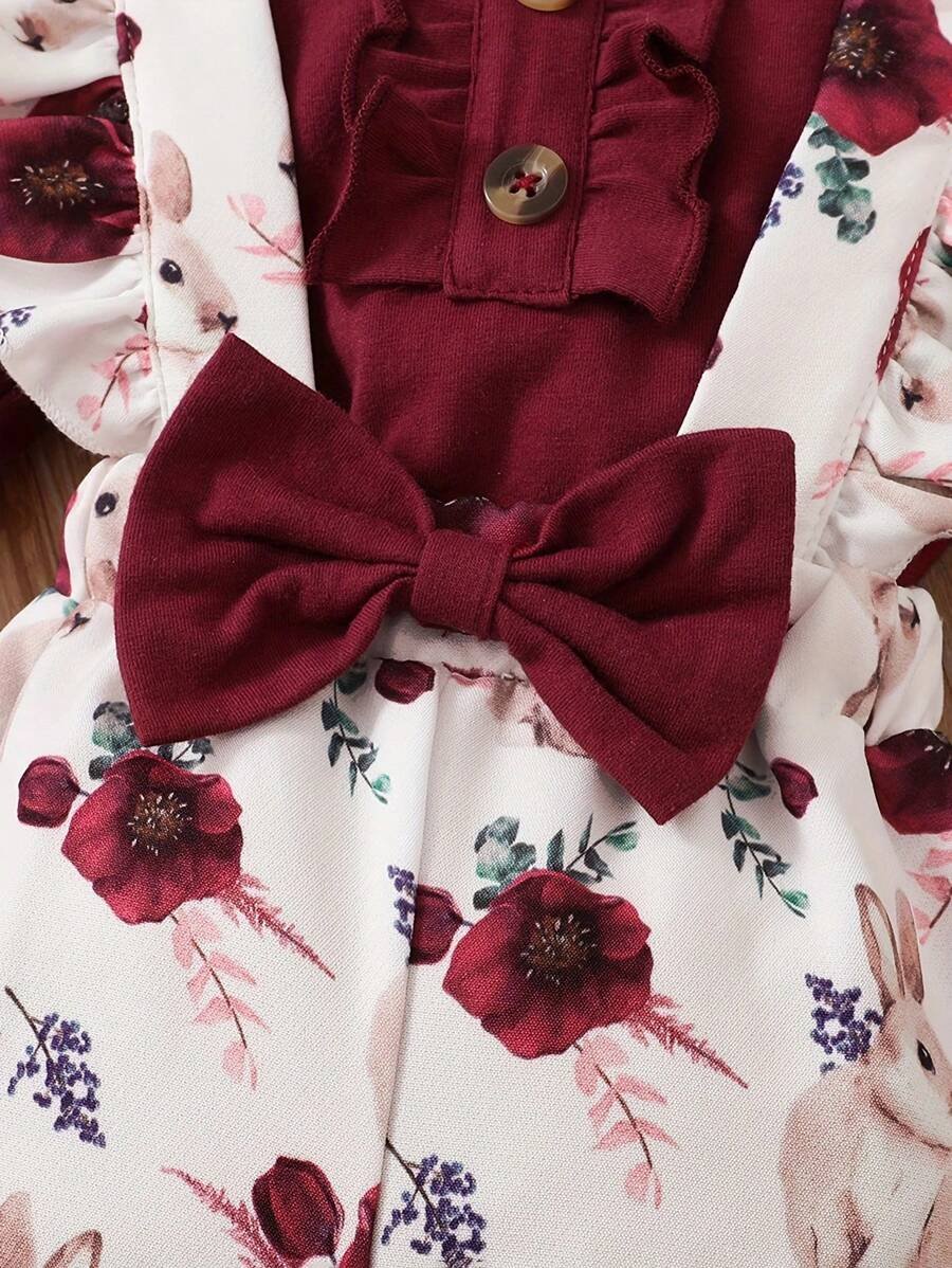فستان بطبعات كرزية كرتونية، أكمام طويلة، فيونكة حمراء