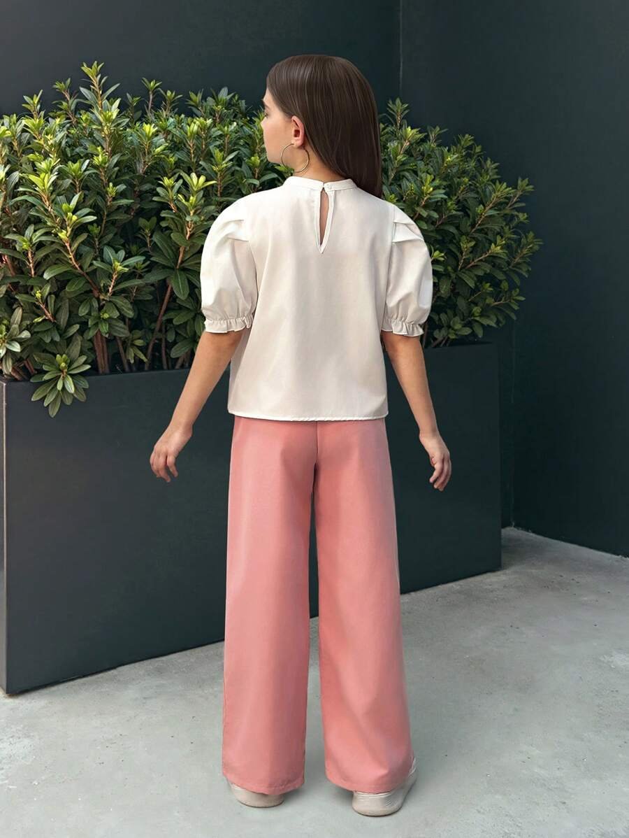 بلوزة بياقة دائرية مزينة بزهور مع بنطلون ملون سادة