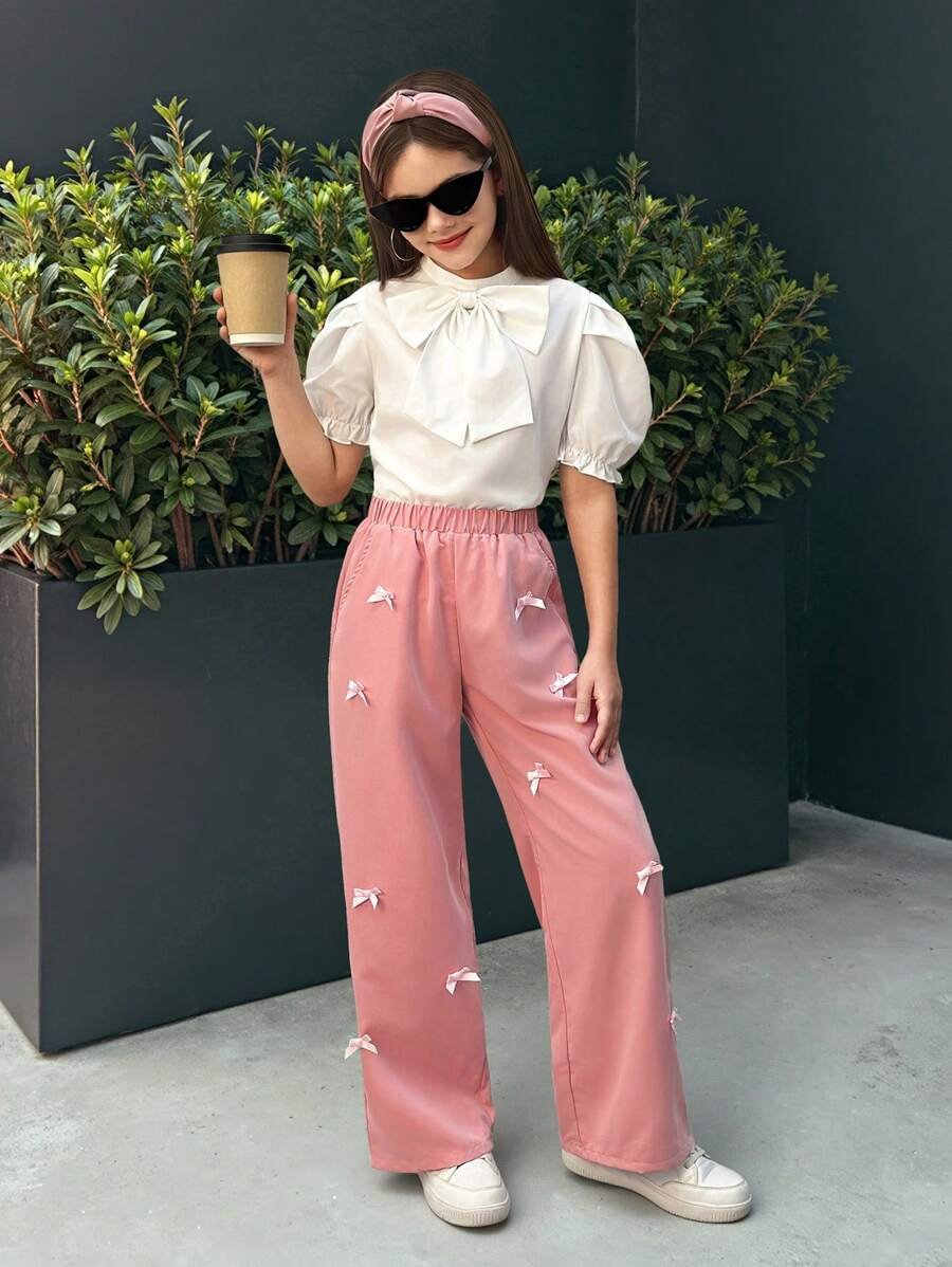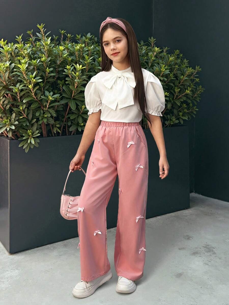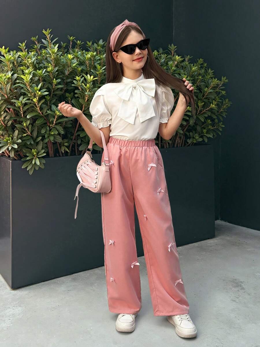طقم بلوزة وبنطال بتصميم فيونكة