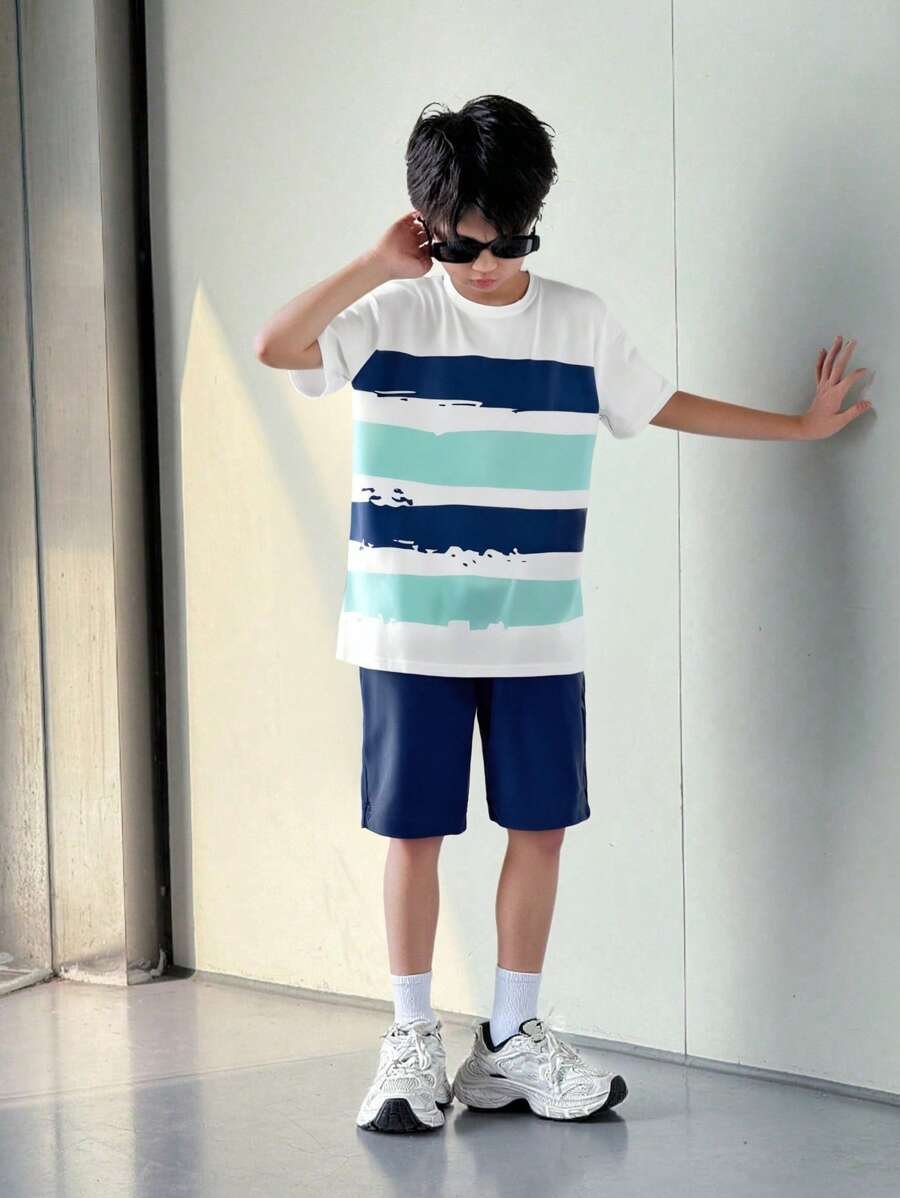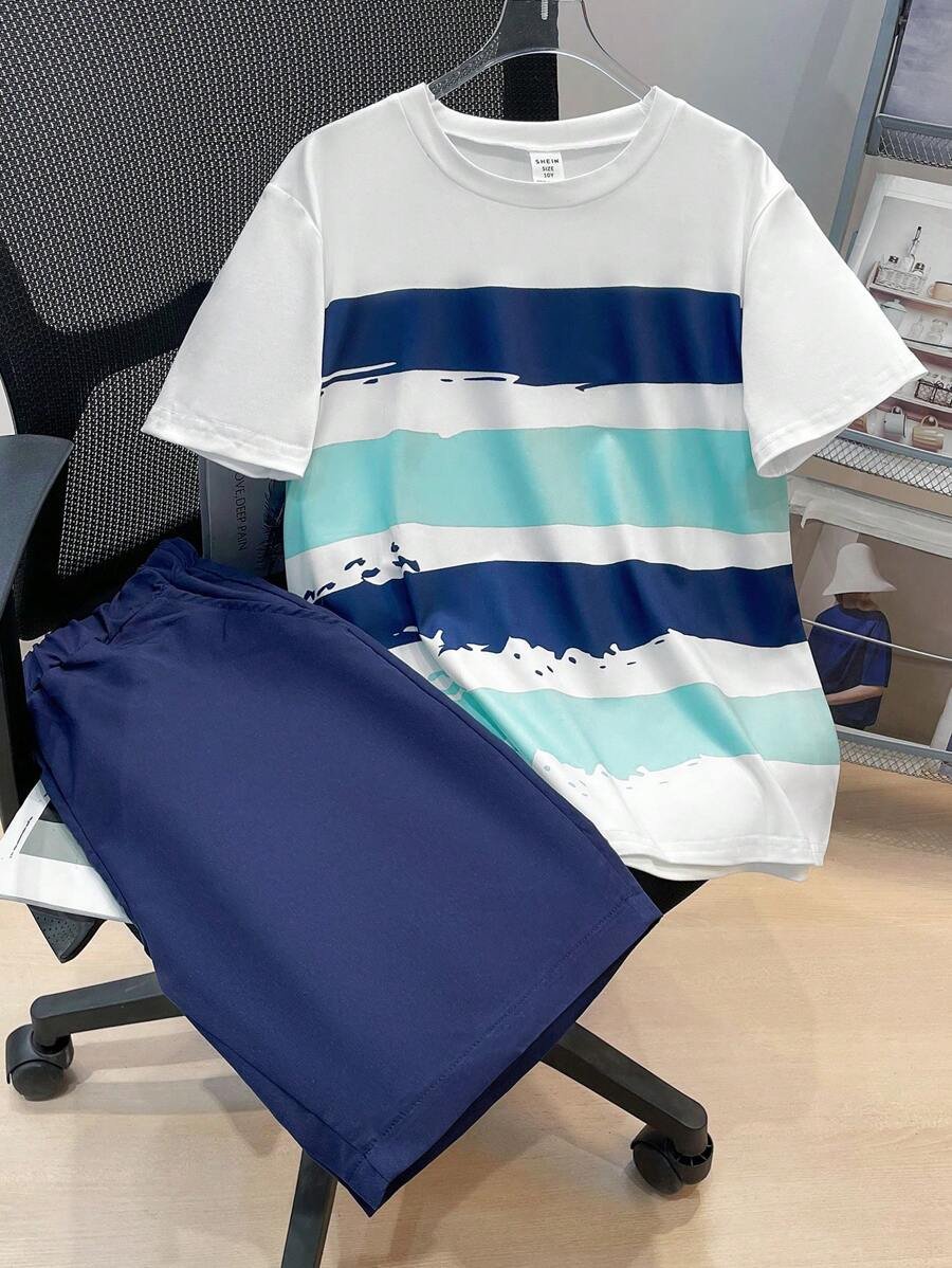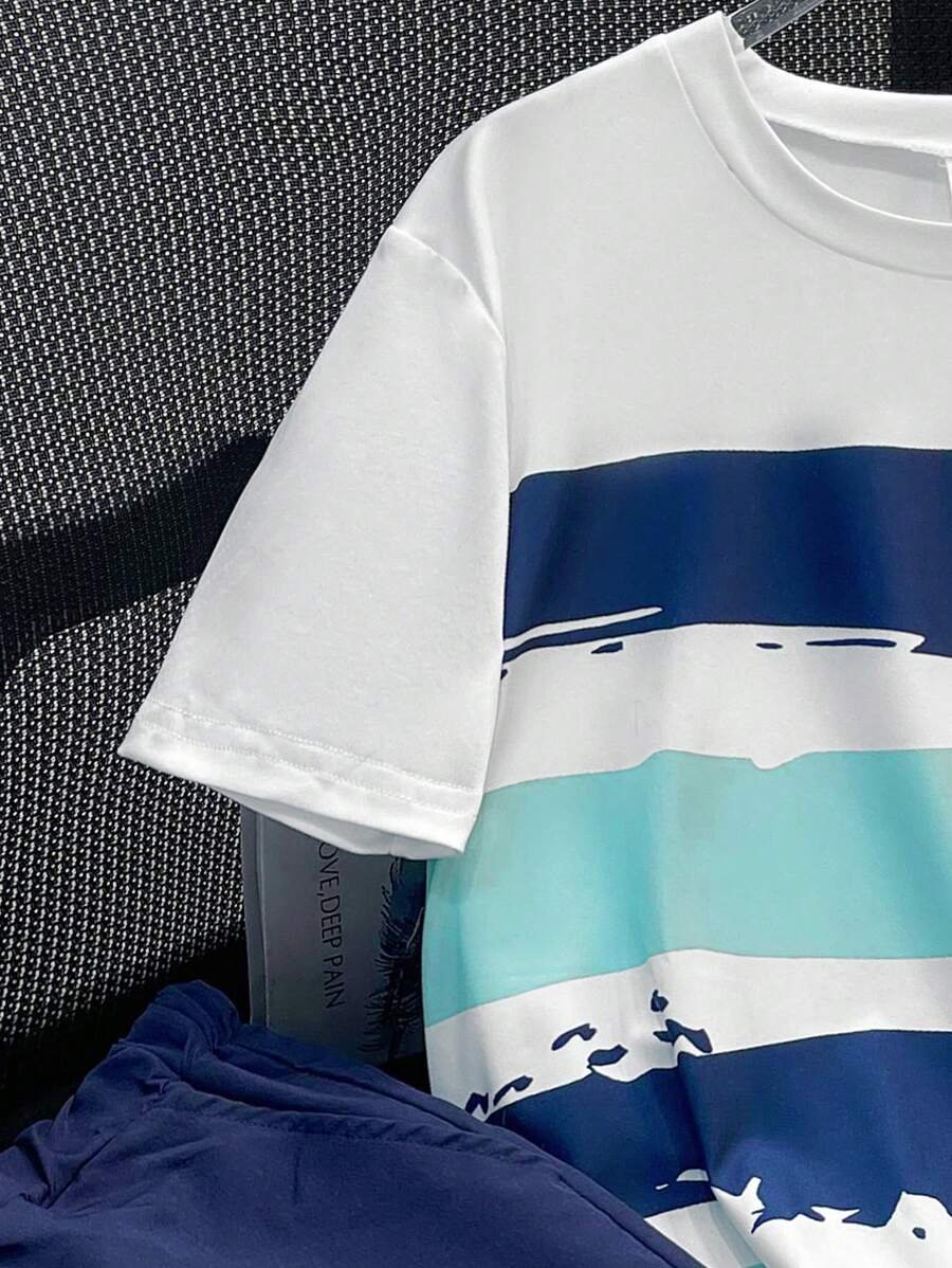 طقم تي شيرت كاجوال قصير الأكمام مخطط وشورت