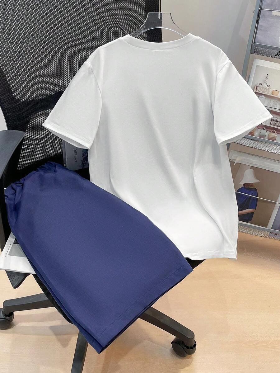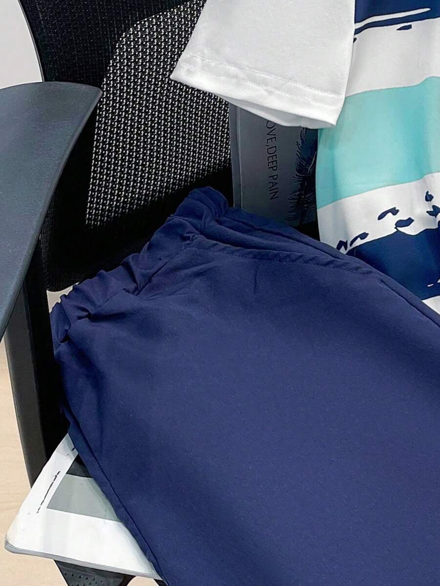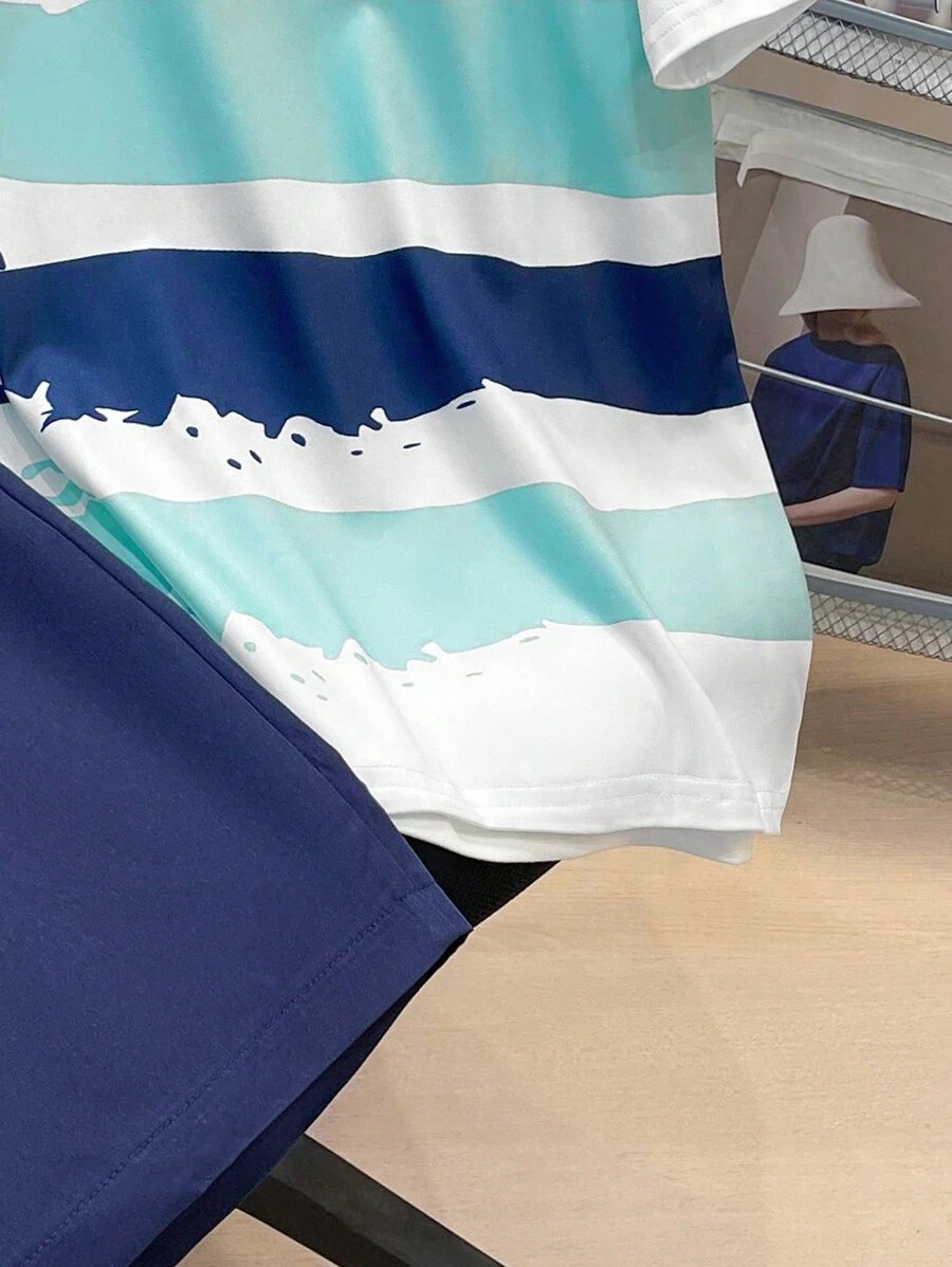 - اسم المنتج: طقم تي شيرت كاجوال قصير الأكمام مخطط وشورت