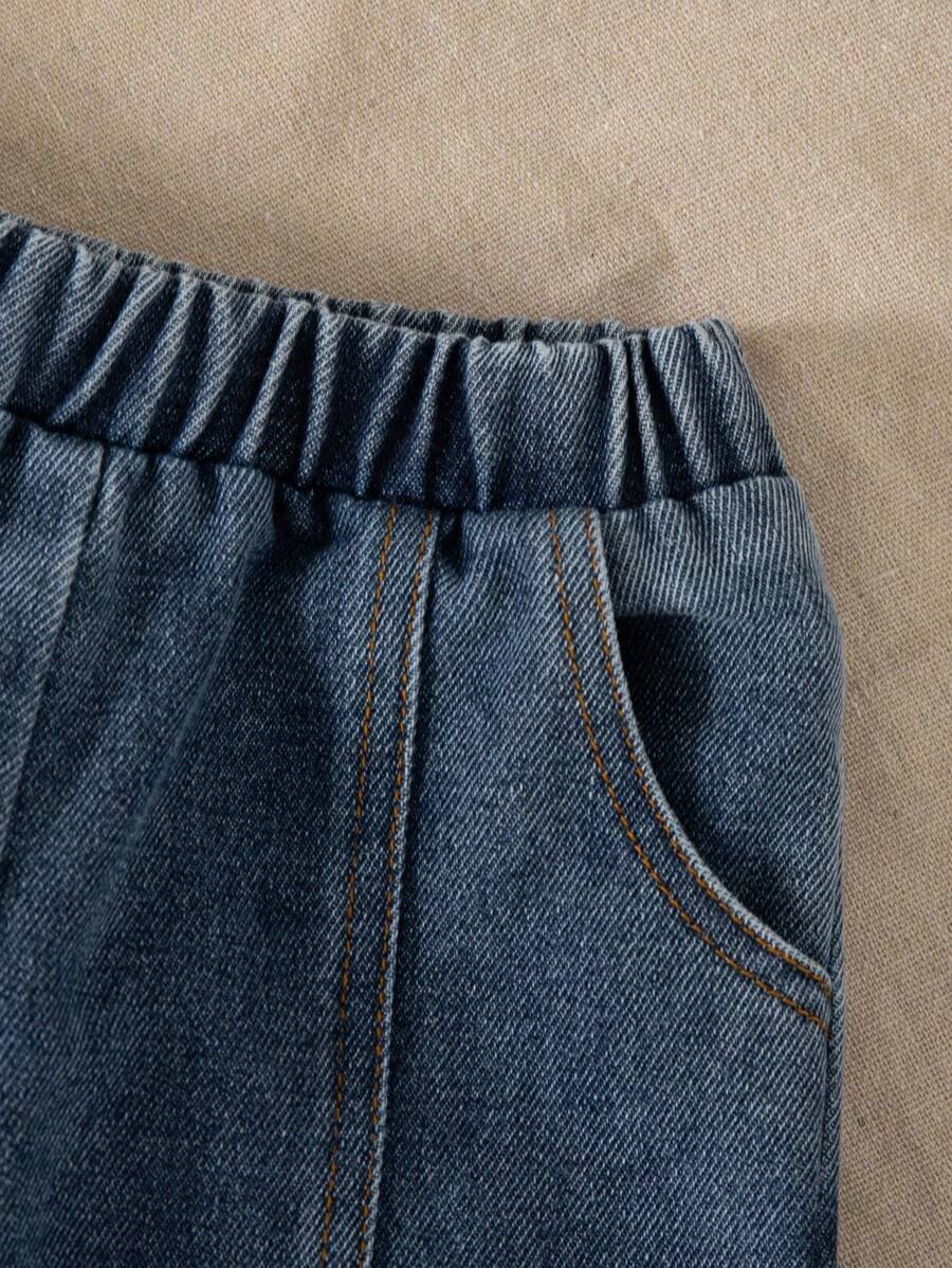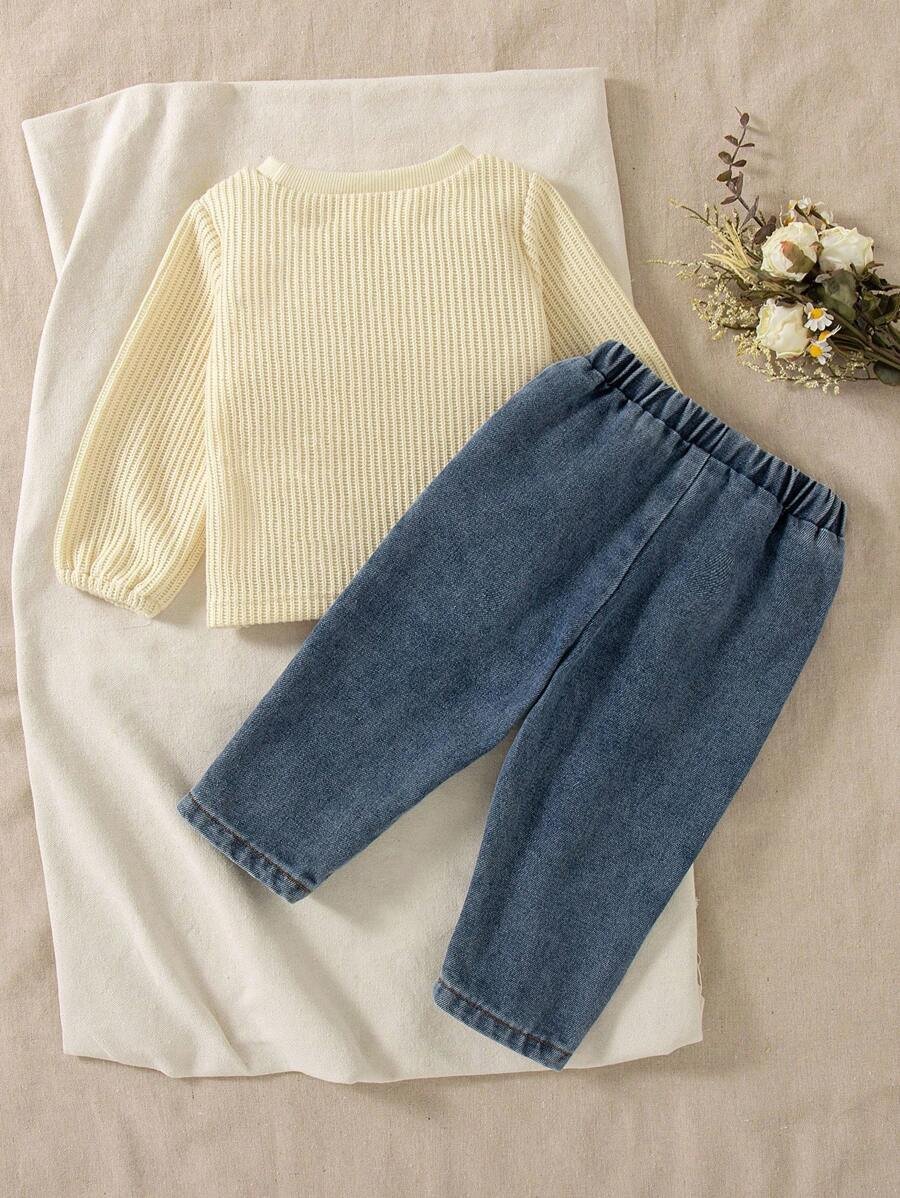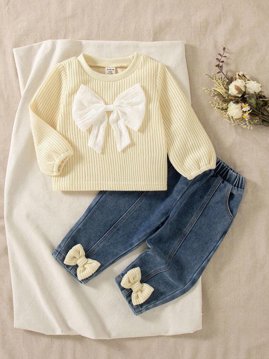 طقم بنطلون جينز وبلوزة طويلة الأكمام مزينة بفيونكة