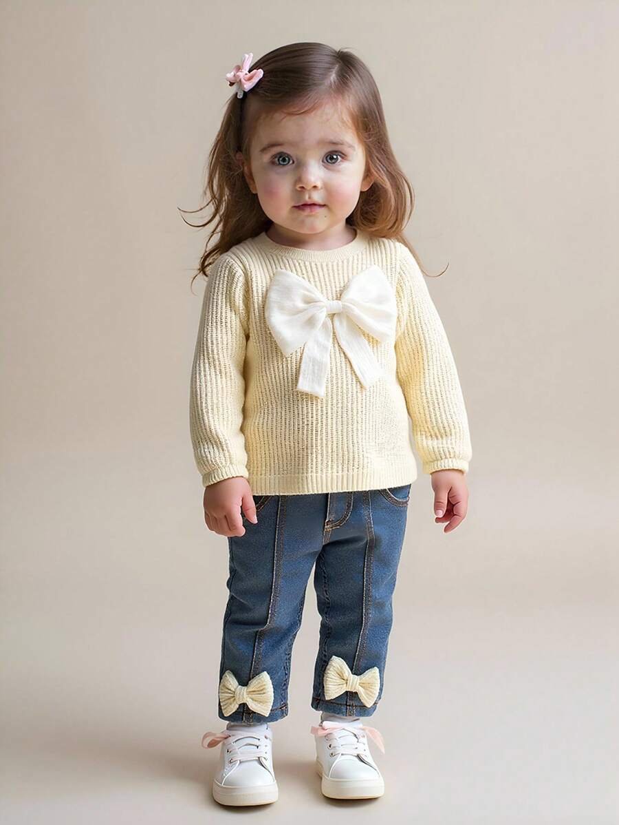 اكتشفي أناقة وكلاسيكية لا مثيل لها مع مجموعة بنطلون الجينز والبلوزة الطويلة الأكمام المزينة بفيونكة للبنات! هذه المجموعة مصممة خصيصًا لتمنح كل فتاة فرصة للتألق بأسلوب مميز وراحة استثنائية.
