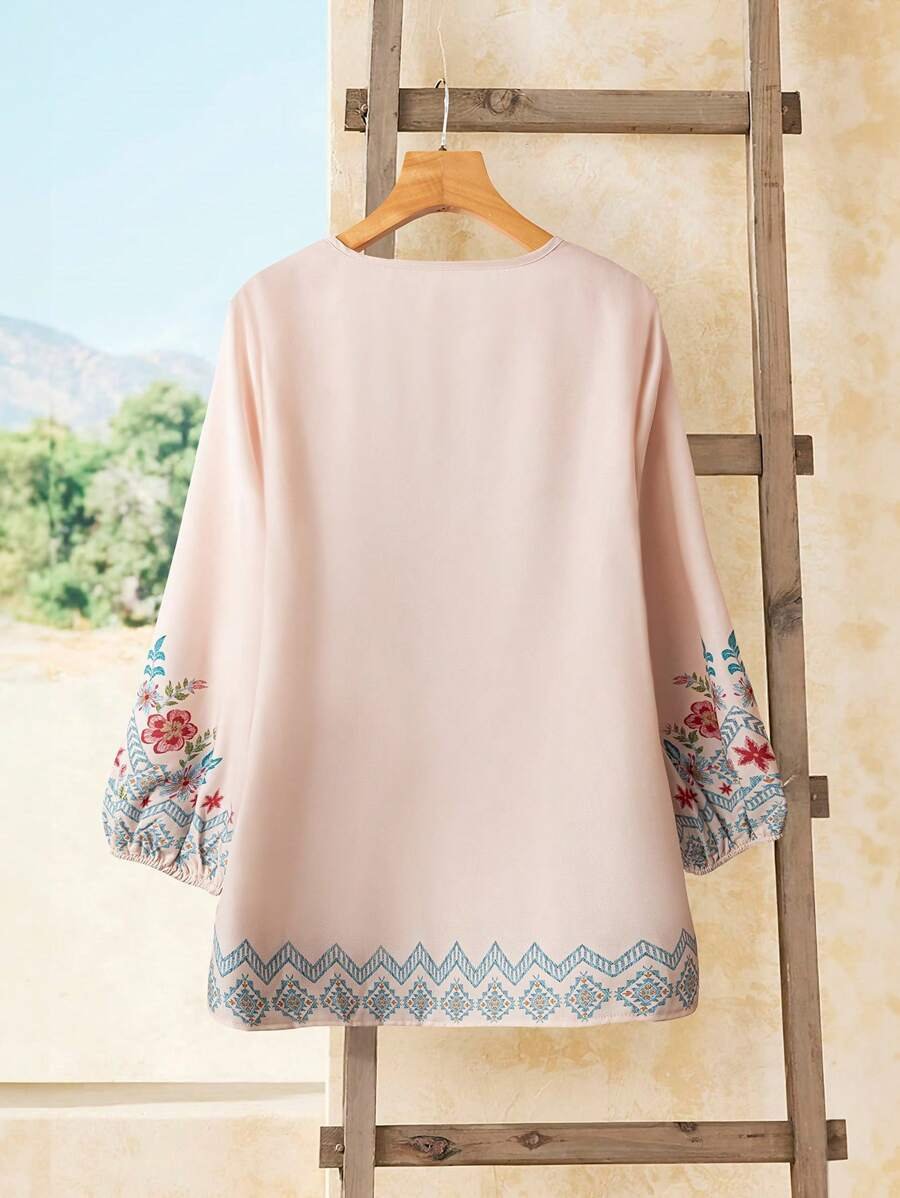 قميص نسائي كاجوال بزهور وردية بأكمام طويلة